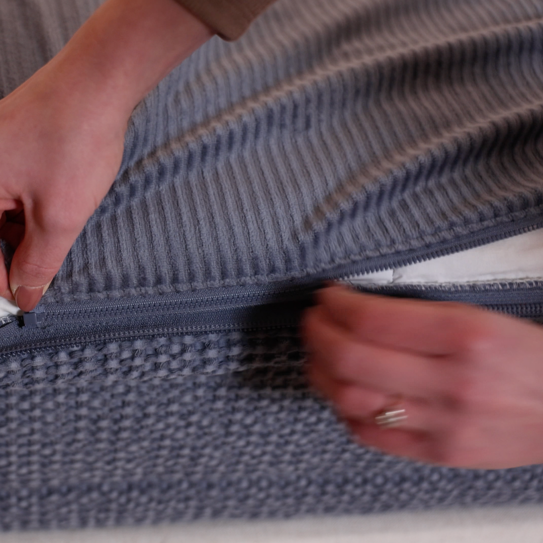 Attach the top comforter piece to the base by zipping up each side, starting at the foot of the bed.
