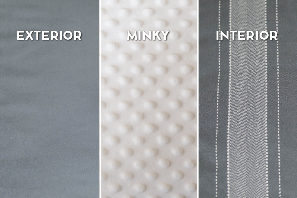 Our minky Beddy’s means the underside of the top comforter has a cozy sewn-in minky blanket. As always, the base or “bottom sheet” is made from soft and breathable 100% cotton. Minky is our most popular (and cozy!) option and is well-suited for most climates.